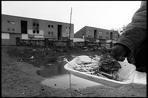 CAN TUNIS BARCELONA DRUGS. El portugues Manuel Machado Aires se pincha en la Ronda de Litoral bajo el cartel de Passeig Can Tunis Cementerio.  Mientras tanto a la señora Felisa, a la buena mujer, le da miedo que se provoque la “alarma social”, que los vecinos se revuelvan en contra suya.  Hay una cosa sensacional, extraordinaria. La Generalitat de Catalunya, el departamento de Sanitat, cedió un autobús nuevo. ¿Saben ustedes que hizo?. Lo primero, exactamente lo primero fue arrancar la pegatina, el escudo de la Generalitat de Catalunya. En todas partes ponen la chapa, pero aquí en Can Tunis hacen precisamente lo contrario: la quitan.  A la mañana siguiente vamos con Satxa’,  un responsable de ASUT, unas siglas que varían según las épocas, y que igual significan Asociación Somos Utiles, como Asociación de Usuarios y ex usuarios de toxicomanías  El chico está por la despenalización de las drogas, por el tratamiento de los drogadictos como enfermos. Nos lleva en su coche, detrás nuestro va un equipo de TVE, de Sant Cugat, para realizar un reportaje  de la demolición del poblado gitano, y del traslado de sus habitantes, es casi una excursión colectiva. Satxa es un  tipo ocurrente, muy vivido, que tiene una pieza de puzzle, y como casi todos piensa que ya tiene el rompecabezas completo. “No hay que preocuparse tanto por el calzado, yo he ido muchas veces en coche y nunca he pinchado”. Es un argumento definitivo. “Aquí por las noches, es como si vieras volar al diablo”. Conoce a todo el mundo. “¡Hombre, cuanto tiempo sin verte!”, le suelta a bocajarro a un caballero. “Es que he estado en la cárcel. Quince días, pillé una borrachera y me cargue una cabina de teléfonos. Me cayeron treinta mil pesetas, pero como no las tenía, pues... para adentro”