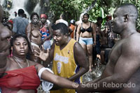 Parishioners and supporters start at an early age. In the photograph a mother holding her daughter while little is in a trance possessed by multiple spirits of voodoo. Women and men of all ages and social classes bathe and pray to purify and cleanse your body. To reach the waterfall the faithful must cross several limestone cliffs. Contact with water represents the climax, but before that happens, the waiting can see how some of his friends move imitating the movement of snakes: they have been possessed by the African goddess Damballah-Wedo. The water falls with great force, so that it is not uncommon to realize that some who are placed under the waterfall allow their clothing to be torn apart, literally. A devout young man was possessed by a Iwa, or spirit. Iwas there are many, such as Baron, who is also known as Baron Samedi. It is the spirit of the dead and guardian of cemeteries. Of his powers depend equally procreation of the living and the putrefaction of the dead and is represented as a skeleton playing with top hat, cane and purple cape. He is often offerings with black cocks, rum, cigars and coffee and its equivalent could be San Gerardo. The voodoo priests, "Houganes, and priestesses," Mambo ", take up role during the three days of festivities and provide the faithful with these herbs rub their bodies while the unstoppable torrent of water falls from the top of the mountain. "This festival blends the traditions of voodoo and honor to the Iwa goddesses with other Christian traditions, such as the veneration of the Virgin of Miracles."