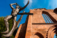 Berlin Sculpture, in the background the Kaiser Wilhelm Gedachtniskirche, Tauentzienstrasse, Berlin, Germany, Europe Berlin is the name of a sculpture on the Tauentzienstraße in western Berlin, the capital of Germany. First conceived in 1985 and unveiled by the husband-and-wife sculpting team of Brigitte Matschinsky-Denninghoff and Martin Matschinsky in 1987, the sculpture's principal motif, a "broken chain", was meant to symbolize the severed connections between West and East Berlin due to the construction of the Berlin Wall. Even though the Wall has since been dismantled, the sculpture was bought by the city from Mrs. Matschinsky-Denninghoff to commemorate the unfortunate chapter in German history. Berlin. Germany. Breitscheidplatz and Europa Center, Berlin, Germany. Breitscheidplatz lies within the Charlottenburg district near the southwestern tip of the Tiergarten park and the Zoological Garden at the corner of Kurfürstendamm and its eastern continuation, Tauentzienstraße, leading to Schöneberg and the Kaufhaus des Westens on Wittenbergplatz. The Europa-Center mall and highrise closes off the Breitscheidplatz to the east. At its centre is the Kaiser Wilhelm Memorial Church with its damaged spire. Berlin. Germany. Franziskaner Klosterkirche (Franciscan Friary Church) ruin, Berlin, Germany. In West Berlin, near Bahnhof Zoo, is the famous Kaiser Wihelm Memorial Church, a partially restored bombed out ruin that today stands as a reminder of the horrors of war. In the eastern part of the city lies another ruin of a much older church that today remains largely forgotten. Just across a busy six lane thoroughfare from Alexanderplatz lies a leafy oasis, a quiet spot away from the crush of the city.  Construction on the original Franciscan Abbey began in 1250 and it was a fine example of early Gothic style until it was destroyed by Allied bombing on 3 April 1945. Today the ruin stands as another reminder of the war that left the city devastated. The space now stands as an open art exhibition space in a garden-like atmosphere. In summer theatre productions are also performed.