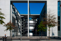 Berlin. Germany. inside Sony Center at Potsdamer Platz in Berlin. Potsdamer Platz (German: [?p?tsdam? plats] ( listen), literally Potsdam Square) is an important public square and traffic intersection in the centre of Berlin, Germany, lying about 1 km (1,100 yd) south of the Brandenburg Gate and the Reichstag (German Parliament Building), and close to the southeast corner of the Tiergarten park. It is named after the city of Potsdam, some 25 km (16 mi) to the south west, and marks the point where the old road from Potsdam passed through the city wall of Berlin at the Potsdam Gate. After developing within the space of little over a century from an intersection of rural thoroughfares into the most bustling traffic intersection in Europe, it was totally laid waste during World War II and then left desolate during the Cold War era when the Berlin Wall bisected its former location. Since German reunification, Potsdamer Platz has been the site of major redevelopment projects. Paul Loebe House, Germany, Berlin. The glass-and-concrete Paul-Löbe-Haus houses offices for the Bundestag’s parliamentary committees. From above it looks like a double-sided comb and on the inside there’s an atrium long enough to be a bowling alley for giants. It’s linked by a double footbridge to the Marie-Elisabeth-Lüders-Haus across the Spree in a visual symbol of reunification. Opening hours vary, depending on parliamentary use. The building named after Paul Löbe, President of Germany’s Reichstag from 1924 - 32, is one of the most impressive federal government buildings on Berlin‘s Spreebogen riverbank. inside Sony Center at Potsdamer Platz in Berlin. Potsdamer Platz (German: [?p?tsdam? plats] ( listen), literally Potsdam Square) is an important public square and traffic intersection in the centre of Berlin, Germany, lying about 1 km (1,100 yd) south of the Brandenburg Gate and the Reichstag (German Parliament Building), and close to the southeast corner of the Tiergarten park. It is named after the city of Potsdam, some 25 km (16 mi) to the south west, and marks the point where the old road from Potsdam passed through the city wall of Berlin at the Potsdam Gate. After developing within the space of little over a century from an intersection of rural thoroughfares into the most bustling traffic intersection in Europe, it was totally laid waste during World War II and then left desolate during the Cold War era when the Berlin Wall bisected its former location. Since German reunification, Potsdamer Platz has been the site of major redevelopment projects. Potsdamer Platz began as a trading post where several country roads converged just outside Berlin's old customs wall.