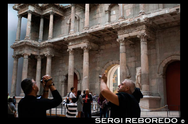 Berlin, Germany. Interior of Pergamon Museum showing Gate of Miletus. Newly restored Market Gate of Miletus at the Pergamon Museum on Museumsinsel in Berlin. The Market Gate of Miletus (German: das Markttor von Milet) is a large marble monument in the Pergamon Museum in Berlin, Germany. It was built in Miletus in the 2nd century AD and destroyed in an earthquake in the 10th or 11th century. In the early 1900s, it was excavated, rebuilt, and placed on display in the museum. Only fragments had survived and reconstruction involved significant new material, a practice which generated criticism of the museum. The gate was damaged in World War II and underwent restoration in the 1950s. Further restoration work took place in the first decade of the 21st century. The gate is a large marble monument,about 30 meters wide, 16 meters tall, and 5 meters deep. The two-story structure has three doorways and a number of projections and niches. At roof level and in between the floors are ornate friezes with bull and flower reliefs. The structure's protruding pediments are supported by Corinthian and composite columns. The gate is not entirely original, as little of the base and lower floor survived the centuries;[4] additional material includes brick, cement, and steel. The gate is affixed by iron girders to the wall behind it. While in Miletus, niches on the second story featured statues of emperors, some fighting against barbarians.