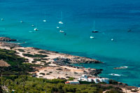 Formentera. Es Pujols, beach, panoramic view, parasol, deck chair, tourism, holiday. Spain, Balearic Islands, south of Ibiza island, Formentera island, Es Pujols beach. Formentera. Swimming pool of Insotel Club Maryland, Migjorn beach, Formentera, Balears Islands, Spain. Holiday makers, tourists, Platja de Migjorn, simming pool, Formentera, Pityuses, Balearic Islands, Spain, Europe. Formentera. Nude woman in Es Calo beach, Formentera Island, Mediterranean sea, Balearic Islands, Spain. Es Calo de San Agusti with boat in Formentera island turquoise mediterranean.