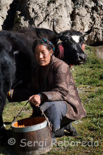A woman milking a cow in a small settlement of Dopkas (pastoralists). Gyantse. These nomads traveling in these parts like ghosts of a past that mountain ranges surrounding us seem reluctant to let go. The hospitality and joy with which we receive is amazing and as we saw later completely devoid of commercialism that might involve comprehensive food and sharing experiences about Western tourists in exchange for a few yuan (one yuan equals about 0.10 euros ). Not even to say goodbye and despite our insistence, our friendly hosts agreed to receive any money in return for their time, and especially food. Outside the store entertain us first, and as is required with a tea made with yak fat somewhat bitter taste and characteristic odor (even today when I recall the smell of these places you think invading Tibetan environment). The burned skin of our hosts is mute witness to the harsh weather conditions in the herdsmen living in these harsh, nevertheless, cheeks flushed, the colorful headdresses adorning the hair and clothing, the slender but small figure showing the most of them and the serenity with which seem to face his destiny makes them appear very attractive to our eyes.